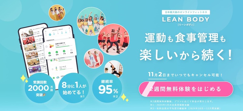 LEAN BODYは、400本以上の本格レッスンを自宅で受けられるオンラインフィットネスサービス。「ジムいらず」で理想の体を目指せる人気のボディメイクプログラムです。