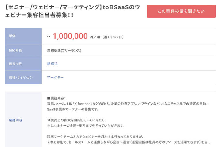 当案件では、事業のマーケターを募集しており、顧客向けセミナーの企画から集客までのインサイド業務を担当します。