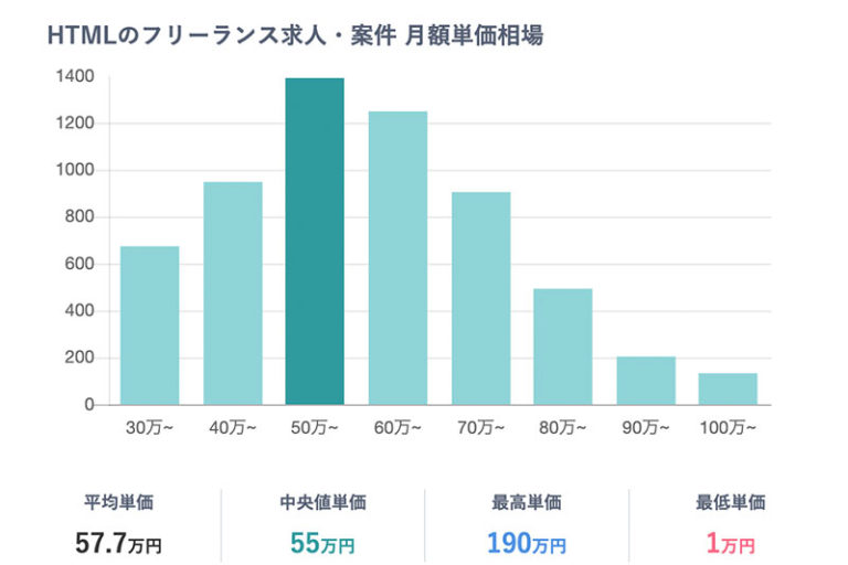 Webコーダーフリーランスの月額報酬は、平均で約54.8万円、中央値で53万円程度となっています。