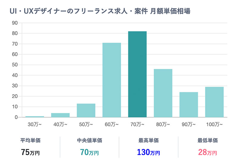 doocy jobの情報によると、フリーランスのUI/UXデザイナーの案件単価は、おおよそ70万円が相場となっています。
