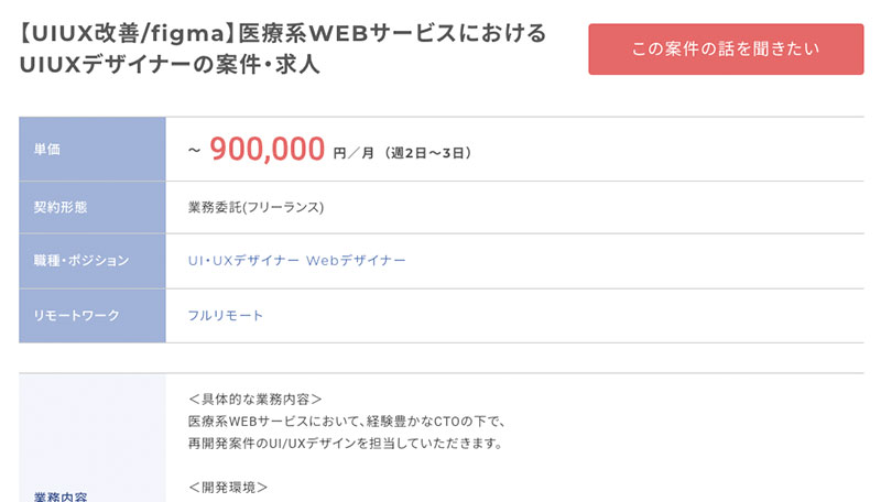 直接取引の案件が豊富に用意されているため、余分なマージンが発生せず、フリーランスのUI/UXデザイナーの年収アップにつながります。