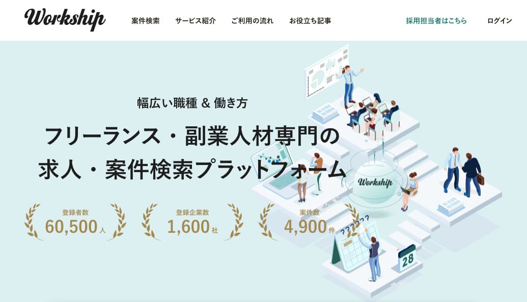 Workshipは、週1日から土日のみの勤務まで、柔軟な働き方ができる案件を中心に扱うマッチングサービスです。