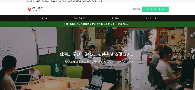 | 料金 | 3ヶ月以上継続プラン ・フルタイムメンバー:16,500円/月 ・平日フルタイムメンバー:13,200円/月 ・平日デイメンバー:11,000円/月 ・ナイト&ホリデーメンバー:9,900円/月 ・平日ナイトメンバー:7,700円/月 ・ホリデーメンバー:5,500円/月 ・登記住所利用:8,800円/月 1ヶ月単位プラン ・マンスリープラン:19,800円/月 |