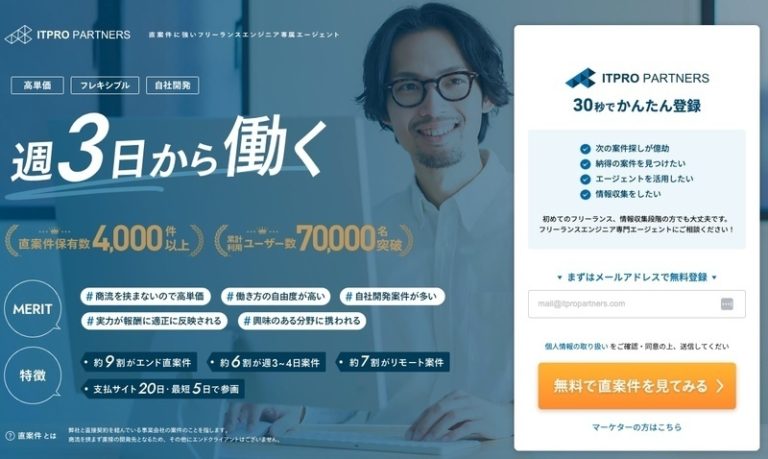 ITプロパートナーズは週3日勤務の案件やリモート案件が豊富に掲載されており、副業ワーカーにとって利用しやすいのが特徴です。