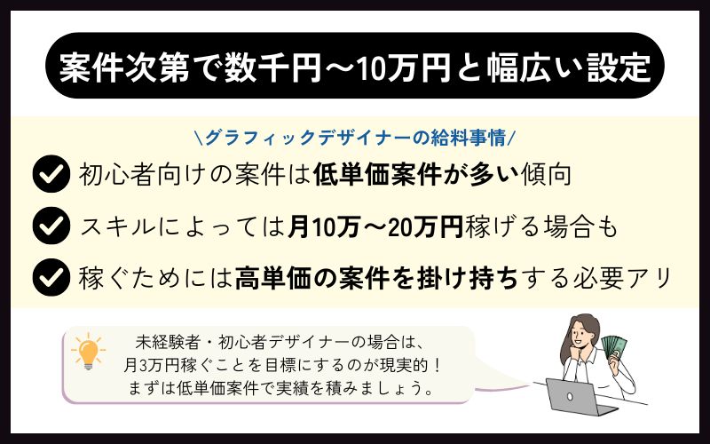 グラフィックデザイナーの副業案件は、数千円から10万円まで幅広く、受注する内容によって大きく変動します。