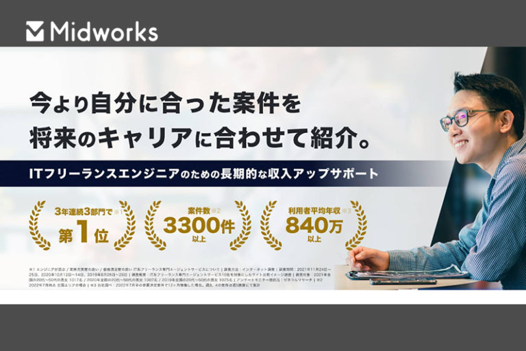 ミッドワークスは、フリーランサーや副業ワーカーに向けて安定収入が見込める案件を紹介するエージェントサービスです。