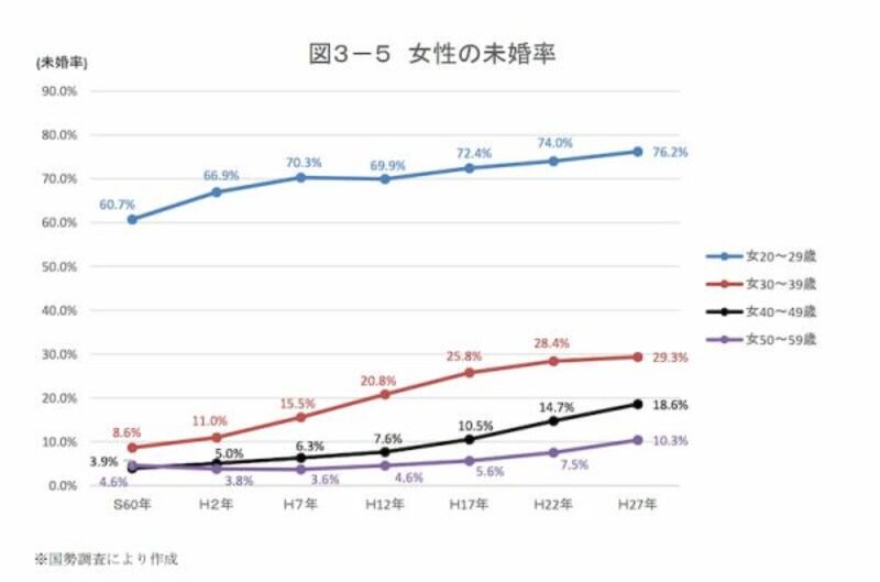 男性と対照的に20~29歳の女性の未婚率が増えている点には、女性も自分のキャリアを考えながら人生設計を立てるようになった時代の変化が反映されていますね。