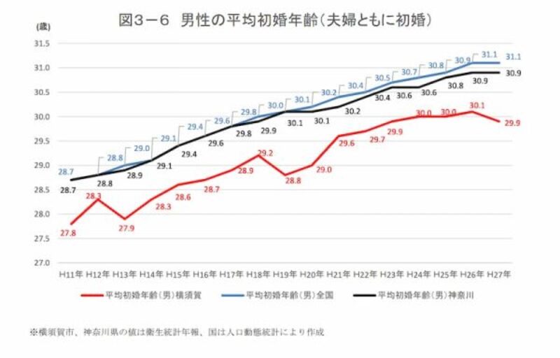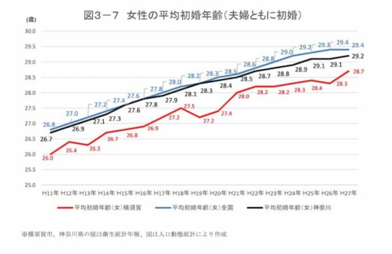 衛生統計年報、人口動態統計によると、全国や神奈川県の平均よりは低いものの、男女共に初婚年齢は年々高くなっています