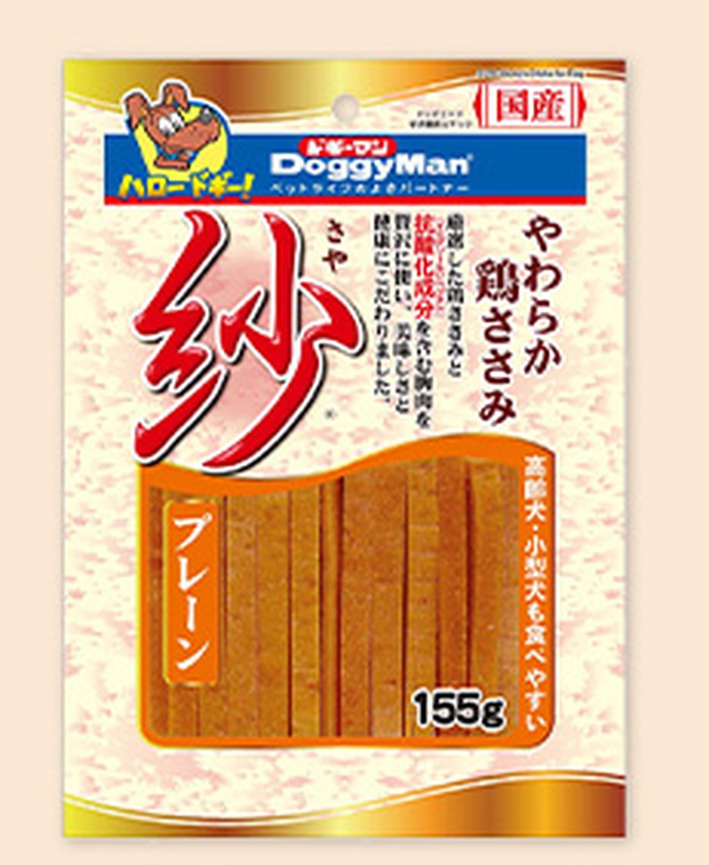 ドギーマン紗は厳選した鶏ささみと元気な体の維持に役立つイミダゾールジペプチドが含まれた鶏胸肉を使用した国産おやつです。