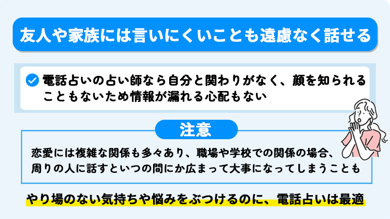 不倫や職場恋愛など、周りに知られたくない悩みも安心して相談できるでしょう。