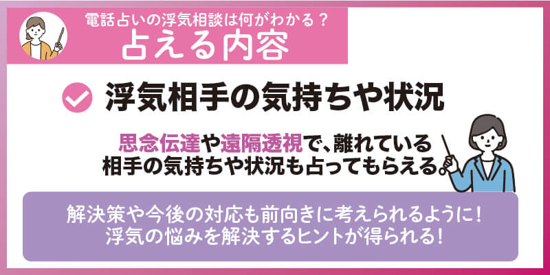 電話占いによる浮気相談では、浮気の真相や浮気度チェックなどさまざまな内容が占えます。