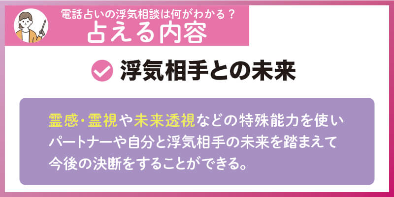 電話占いには霊感・霊視や未来透視などの特殊能力を持った占い師も多いため、浮気相手との未来すら読み取ってもらえます。