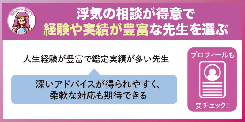 - 浮気相談が得意な鑑定歴の長いベテランの占い師がおすすめ