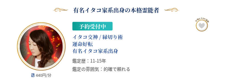 | 鑑定料金 | チャット:1分110円~ 電話:1分130円~ ビデオ対面:20分2,800円~ メッセージ:1件3,300円~ |