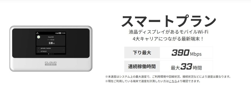 プランはデータ量1日500MB・1GB・無制限の3つから選べ、無制限プランは、1日840円でレンタルできます。