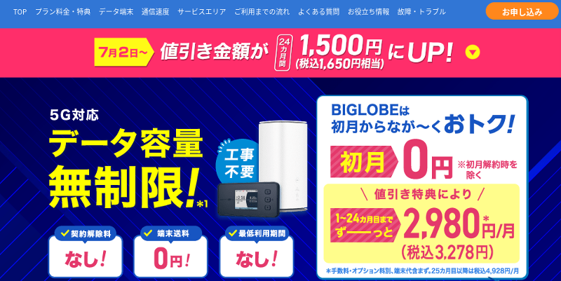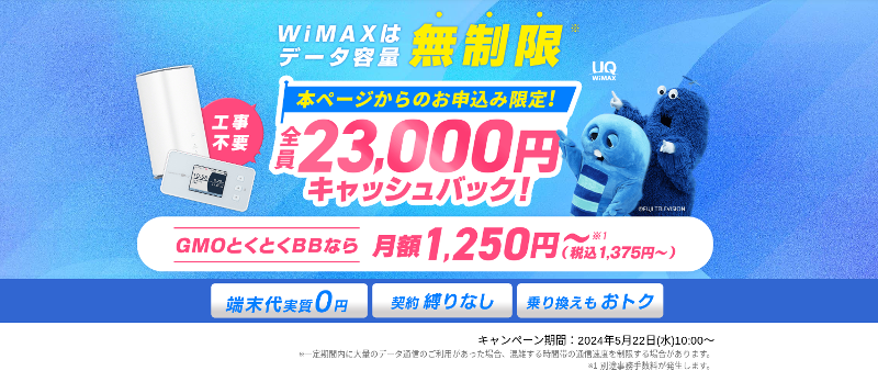 WiMAX GMOとくとくBBの特徴は、端末発送月の利用料金が1,375円で利用できることです。そのため、契約時の初期費用を抑えられます。